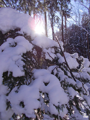 The gorgeous snow of just days ago has fallen to high temperatures and torrential rains. This morning the rains came through the area like walls of water. One could follow them coming and wondered how much harder could the rain possibly fall? Now there is the mixture of warm air and cool snow on the ground. This cloud runs the length of the stream as far as I could see.